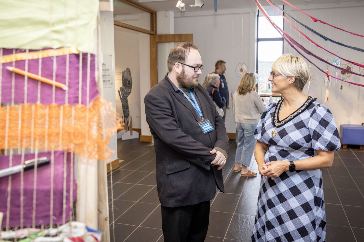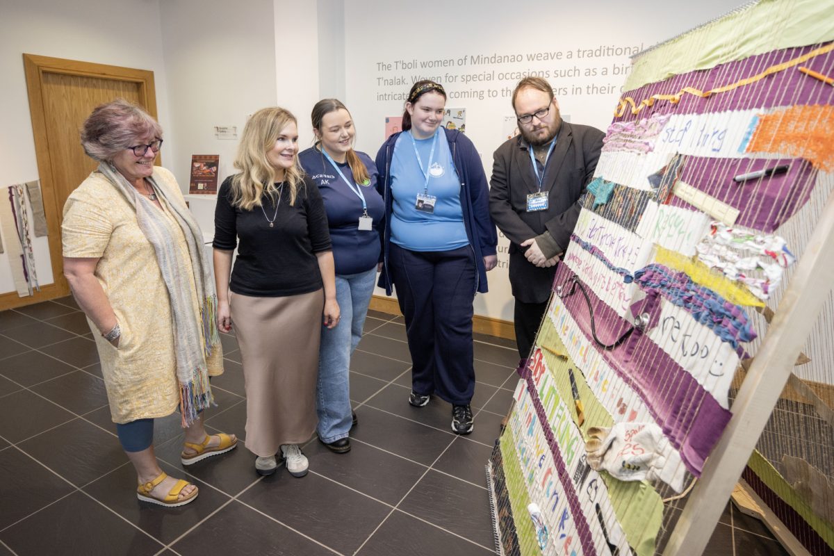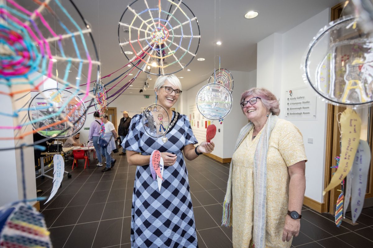 We are the Dreamweavers showcases a giant weaving loom led by spinner and weaver, Lorna Shannon, together with the children of Limavady’s Roe Valley Residents Association, using mixed media and recycled materials.