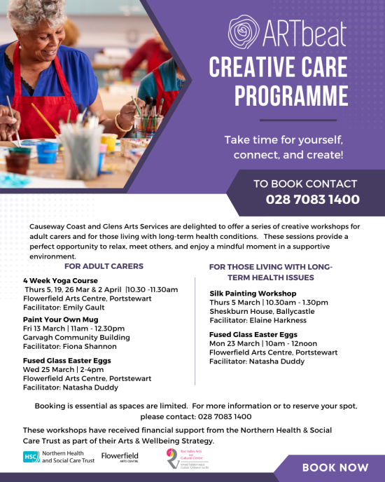 Causeway Coast and Glens Arts Services is delighted to announce a new series of subsidised creative workshops for adult carers and for those living with long-term health conditions. These sessions provide a wonderful opportunity to relax, meet others, and enjoy a mindful moment in a supportive, welcoming environment.