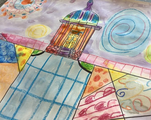 Create a folk art inspired local landscape using oil pastels and watercolour techniques inspired by artist Heather Galler