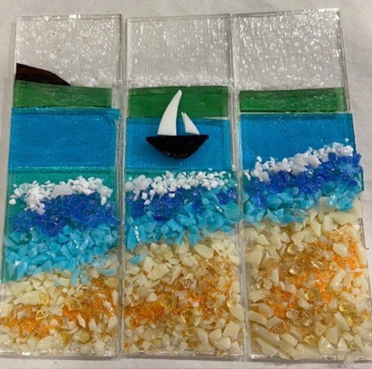 Design a serene beach or shoreline scene using layered glass to evoke depth, horizon lines, and the calming beauty of the coast.