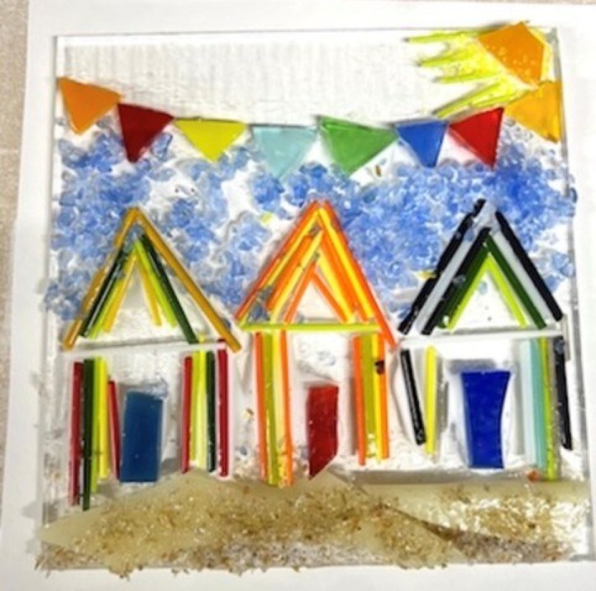 Design a row of cheerful beach huts in bright, playful colours. Explore layering, pattern, and colour choices to craft a glowing seaside scene.