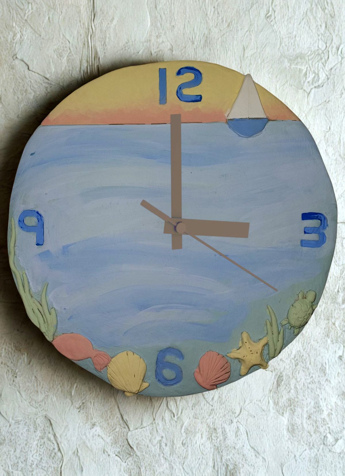 Design and hand-build a unique seaside-inspired ceramic clock, using simple techniques to shape and decorate with coastal textures, patterns, and motifs from waves and shells to boats